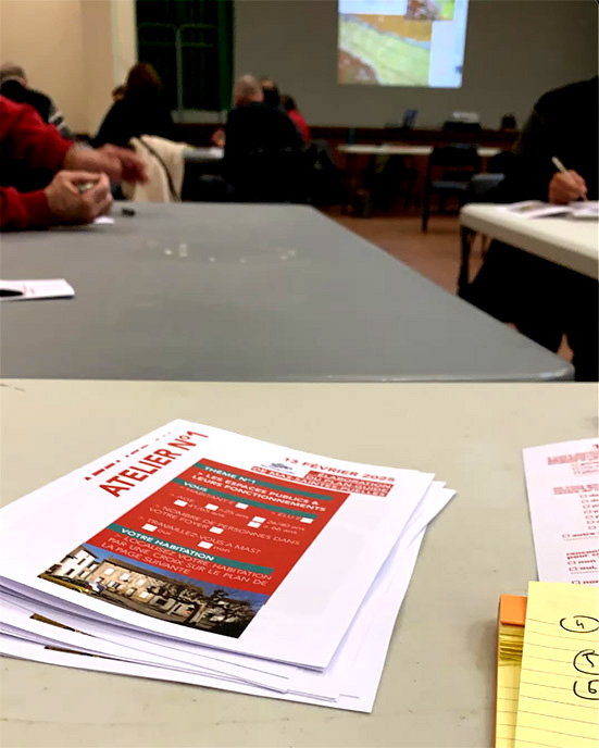 > entretiens individuels & ateliers (personnes sinistrées, population du village, élus) dans le cadre de l ‘étude de recomposition urbaine après les inondations d’octobre 2018 à St Hilaire et à Couffoulens